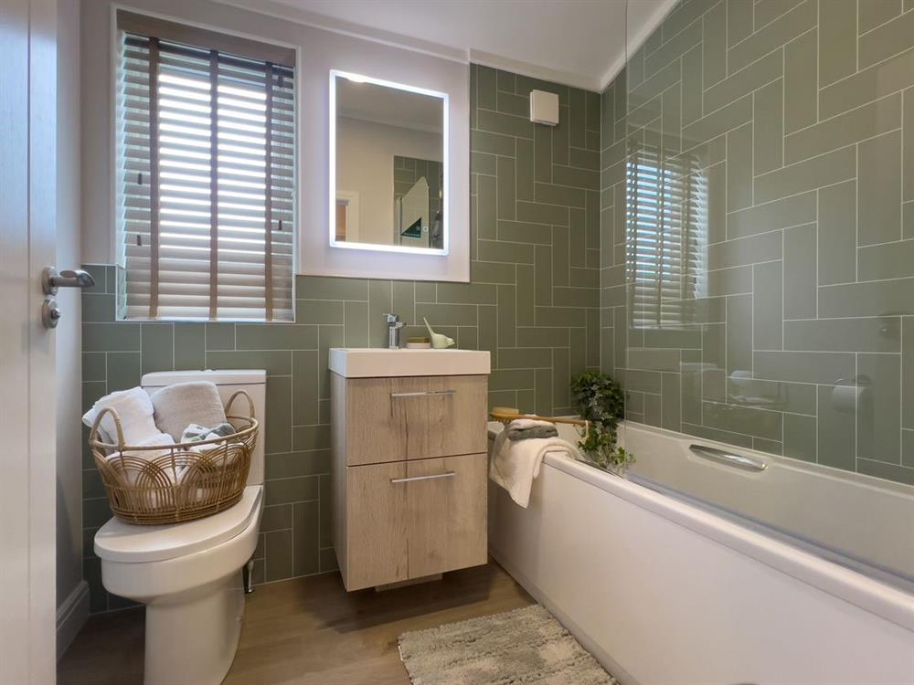 A chic main bathroom with a rainfall shower over the bath, illuminated Bluetooth mirrors, and high-end finishes adds an extra touch of indulgence.